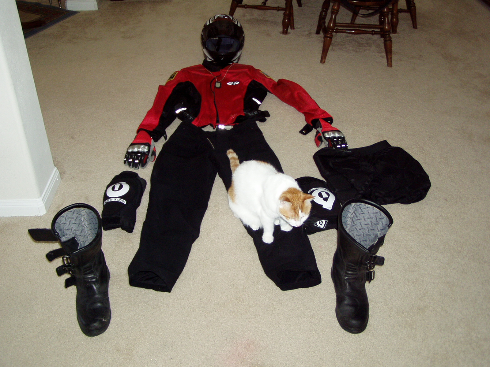 My summer riding gear: Helmet, vented jacket, gloves, shorts with impact padding, knee armor, riding pants and