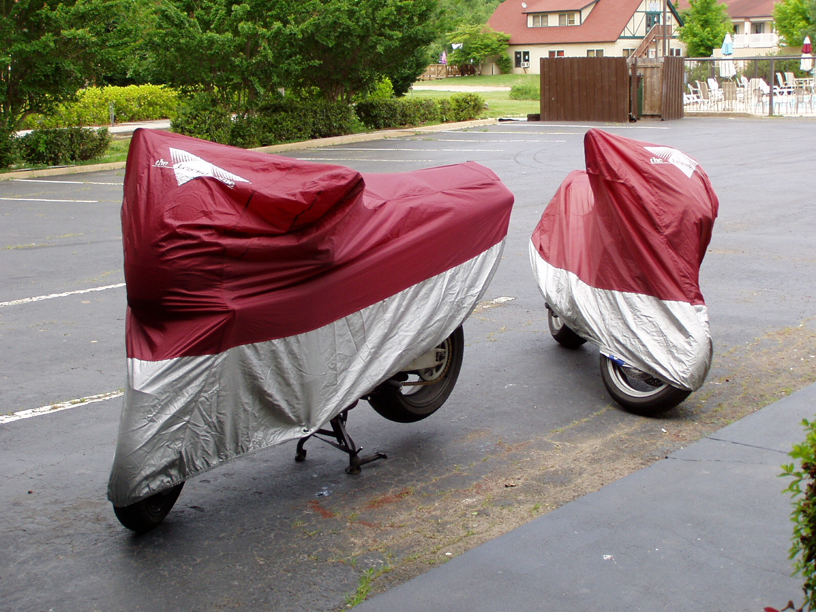 When we get to Helen and pull into the parking spot at the hotel several drops of rain start appearing on the windshields and pavement; our timing is everything. Actually that was all the rain we saw for the rest of the day but we're ready to get off the bikes.